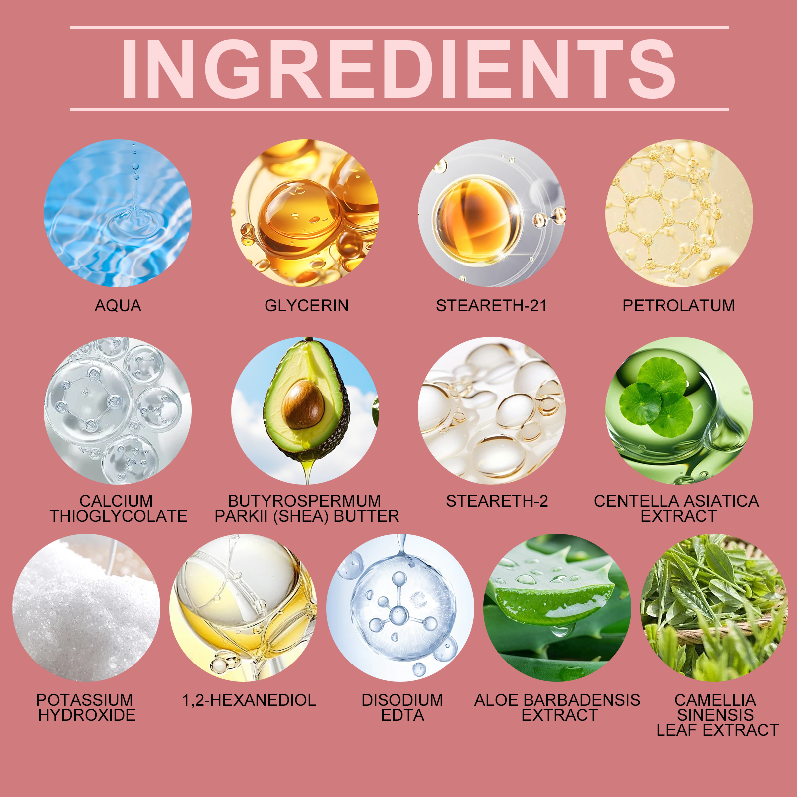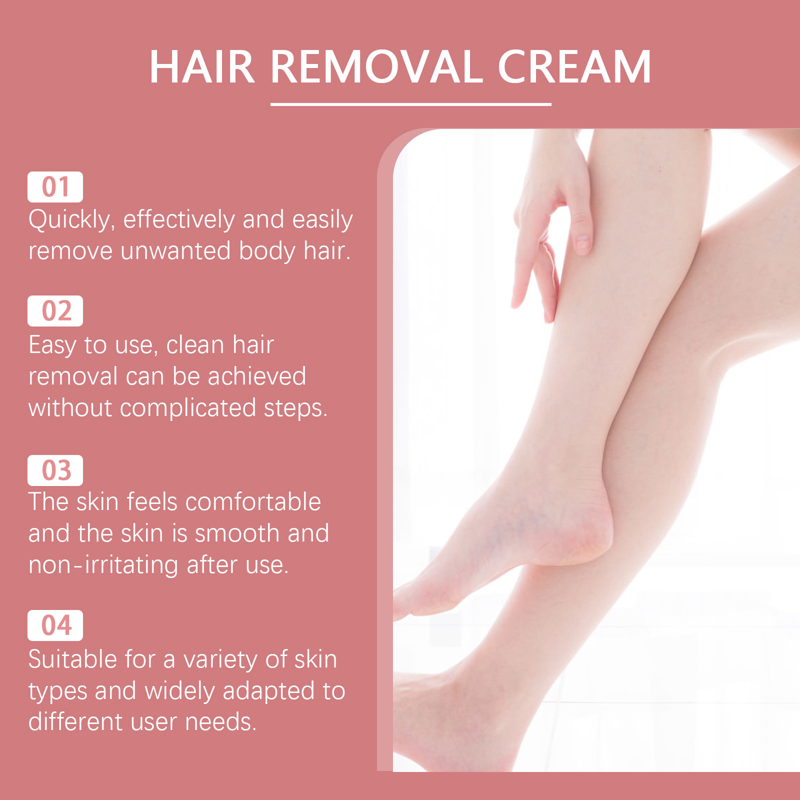 Our hair removal cream contains aloe vera leaf extract and tea leaf extract. It can effectively remove body hair in a short time. Its application method is very simple: clean the skin of the part that needs to be removed, apply an appropriate amount of this product evenly on the skin, wait for 5 minutes, wipe off the residue, wash with warm water. And can be suitable for sensitive skin, mild and non-irritating.